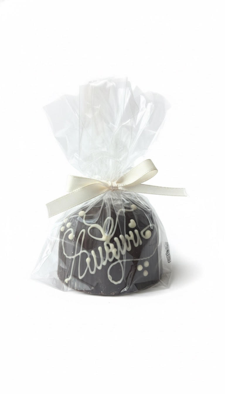 Il Nocciolato alla Gianduia è una deliziosa semisfera di cioccolato fondente decorata con una scritta di auguri e farcita con un cuore cremoso di gianduia e nocciole croccanti.